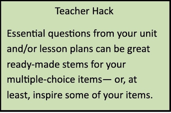 Quick-reference lists can help you improve item and overall assessment validity. Refer to your unit plan or lessons for essential questions and enduring understandings. List these using a few key words for each. Do the same for skills (behaviors). These lists represent your measurable content and skills. Check-off the list items as you address each with one or more multiple-choice questions. This will ensure each question addresses specific content and skills and that you cover all of what you need to cover. A few moments devoted to creating lists of what is to be measured and connecting drafted items to these lists can improve assessment validity and your efficiency.
