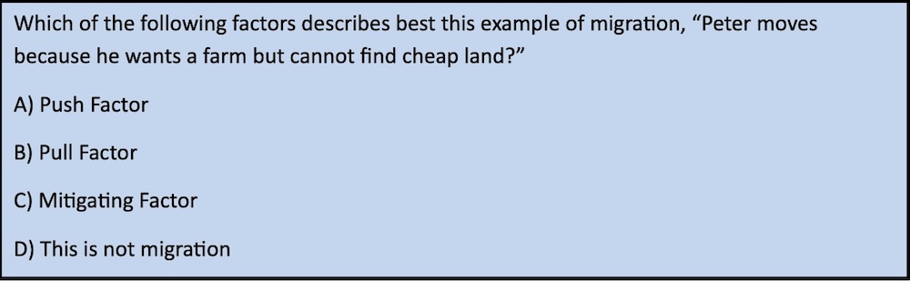 Students reading the options may forget or confuse the purpose established in the stem. Could the student inadvertently switch “the ask” from push to pull while reading through the options? Is the item intended to measure a student’s memory, reading ability, or ability to differentiate between push and pull factors? Consider the following alternative…