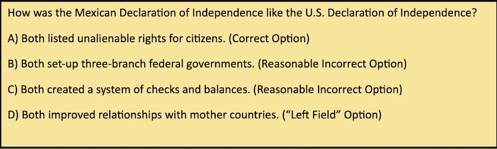 4) Creating a “left field” response for the fourth option is helpful when trying to determine the effectiveness of instruction and students’ preparations. A large number of students choosing this option for a given item is usually a red flag regarding the teaching of the measured content or skill. A student choosing a significant number of left field options within a given assessment indicates the student is experiencing some significant confusion, dealing with an issue unrelated to the class interfering with performance, or needs some coaching in regard to study habits. Here is an example showing purposeful options…